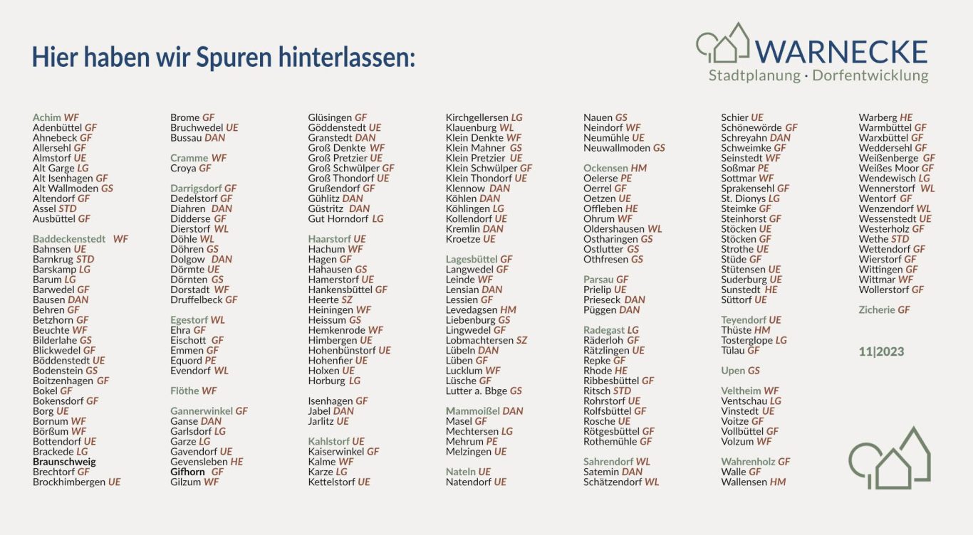 Überwiegend sind wir für ländliche Gemeinden aktiv, die keine eigenen Kapazitäten für die Erarbeitung von entsprechenden Planungsleistungen besitzen. Durch unseren Bürostandort in Braunschweig erstreckt sich unser Tätigkeitsbereich vor allem auf den Raum zwischen Harz und Elbe im östlichen Niedersachsen.